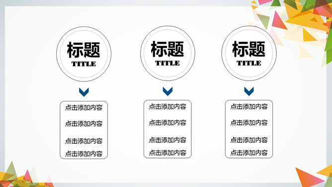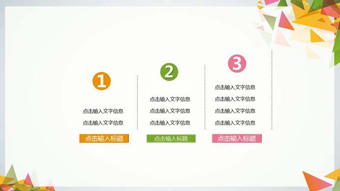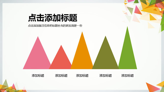 多彩三角形装饰多用途PPT模板。一份多功能多通用幻灯片模板,缤纷彩色三角形装饰,多彩配色,图形图表页面丰富。