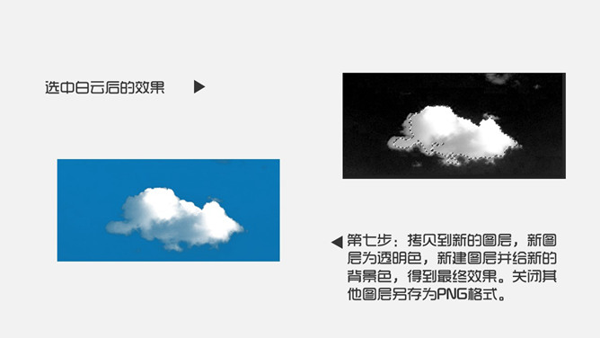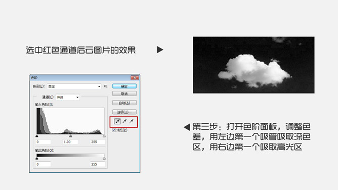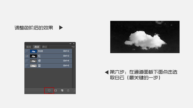 用PS六步获取白云素材。第一步:在百度中获取相应图片。第二步:用PS打开网上获取的图片。第三步:打开色阶面板,调整色差,用左边第一个吸管吸取深色区,用右边第一个吸取高光区。第四步:打开后复制图层。第五步:打开通道面板,选中一色差较大的通道,这里选中红色通道。第六步:在通道面板下面点击选取白云(最关键的一步)。第七步:拷贝到新的图层,新图层为透明色,新建图层并给新的背景色,得到最终效果。关闭其他图层另存为PNG格式。