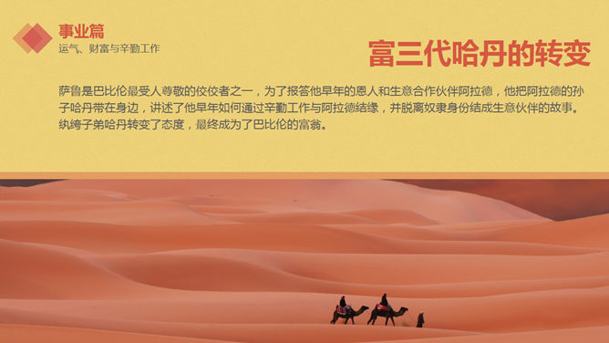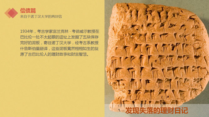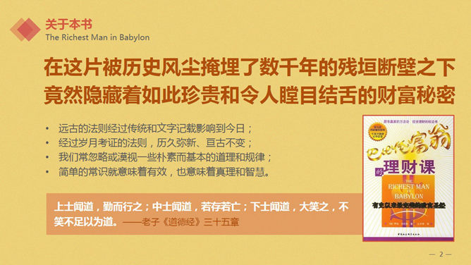 巴比伦富翁的理财课PPT读书笔记。关于《巴比伦富翁的理财课》:在这片被历史风尘掩埋了数千年的残垣断壁之下,竟然隐藏着如此珍贵和令人瞠目结舌的财富秘密。