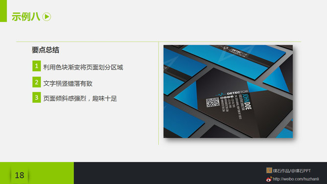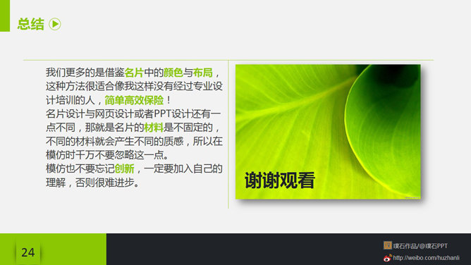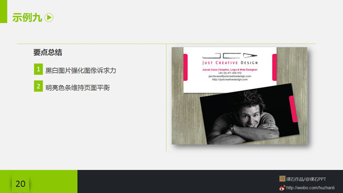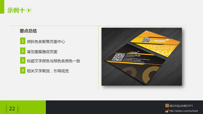 从名片设计获取灵感制作PPT封面。作者举了几个名片设计的例子,再按照名片设计风格制作PPT封面,很有启发意义。