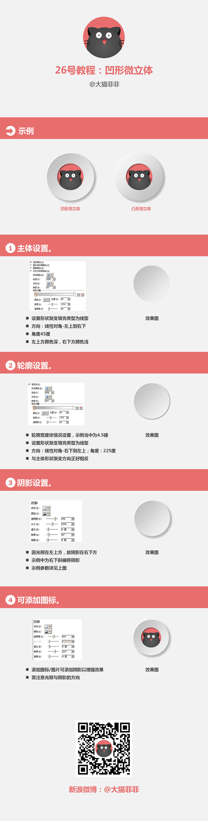 凹形微立体PPT制作教程。大猫菲菲26号教程:凹形微立体。1、主题设置:设置形状渐变填充类型为线性,方向为线性对角-左上到右下,角度为45度,左上方颜色深,右下方颜色浅。2、轮廓设置:轮廓宽度依情况设置,设置形状渐变填充类型为线性,方向为线性对角-右上到左下,角度为225度,与主题形状渐变方向正好相反……