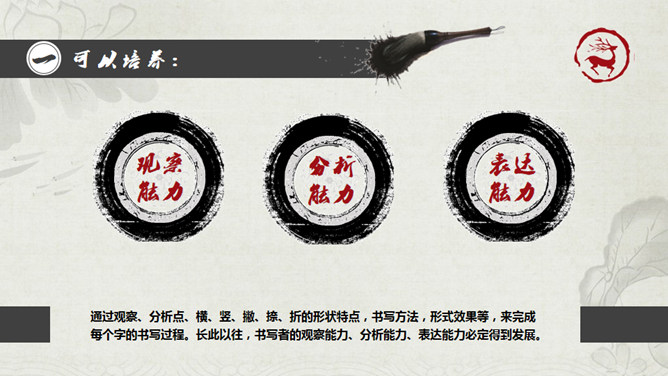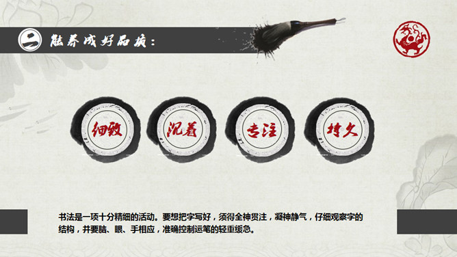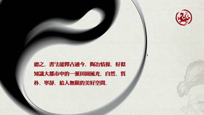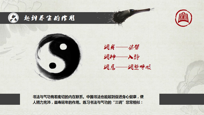 毛笔墨迹古典古风PPT模板。一份古典中国风幻灯片模板,采用毛笔、墨迹、太极等元素配合毛笔字体设计,介绍了写书法的六大好处。建议安装字体: