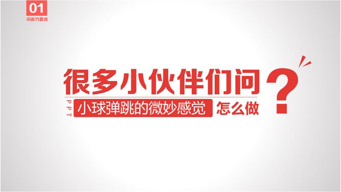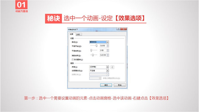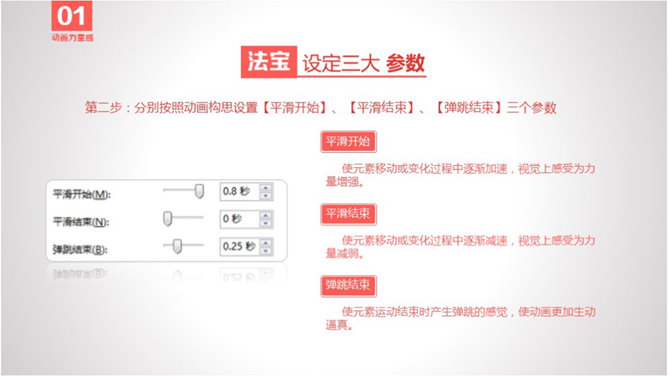 PPT动画效果基础设置教程。小强弹跳的微妙感觉怎么做?怎么让动画具有力量感?秘诀:选中一个动画-设定【效果选项】,然后分别按照动画构思设置【平滑开始】、【平滑结束】、【弹跳结束】三个参数。