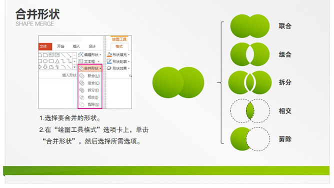 合并形状选项效果示例。作者以两个圆形合并举例,展示了联合、组合、拆分、相交、剪除五种选项的具体效果。