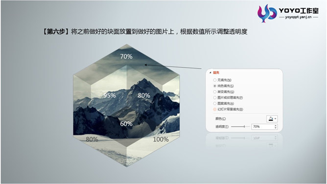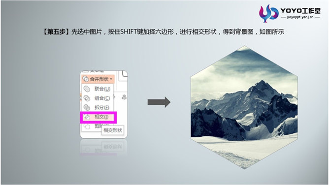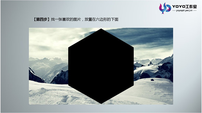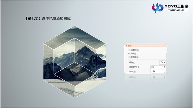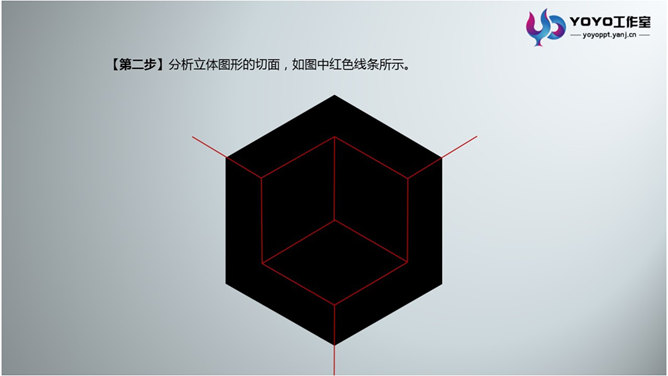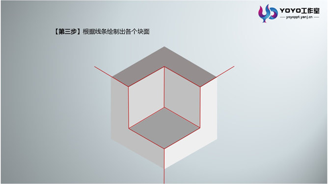 PPT绘制立体多边形图形。步骤:1、绘制一个六边形。2、分析立体图形的切面,如图中红色线条所示。3、根据线条绘制哥哥块面。4、找一张好看的图片,放置在六边形的下面。5、选中图片,按住Shift键加择六边形,进行相交形状,得到背景图。6、将之前做好的块面放置到做好的图片上,调整透明度。7、选中色块添加白线。