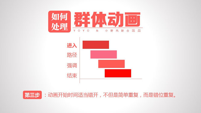 PPT制作群体动画技巧教程。现在比较流行碎片动画,这种群体动画怎么做?第一步:给每个动画增加出现-路径-强调-结束动画。第二步:确定动画起始点,一般是四周向中心聚拢或者中心向四周发散。第三步:动画开始时间适当错开,不但是简单重复,而是错位重复。