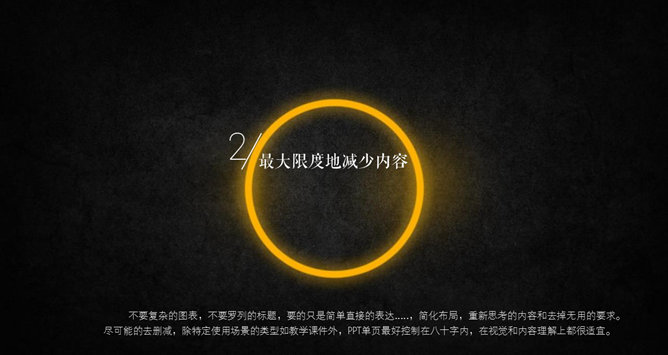 简约PPT设计要点。什么是简约设计?少即是多,但并不是所有造型单纯的设计就有简约的气质。有时反倒是简单、甚至简陋。反之,有的设计运用的元素颇多,看起来形状繁复,但却着实透露出简约气质。基本原则:少即是多,确定优先级;最大限度减少内容;适度使用色彩;不要吝啬使用纹理和渐变;留白能创造独特格调。