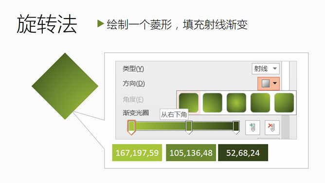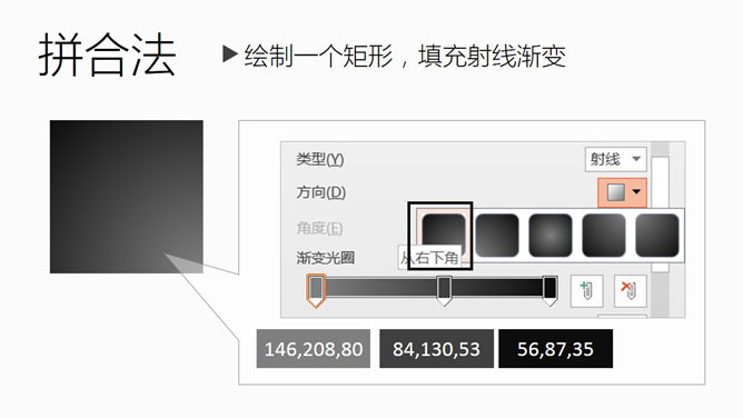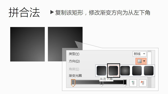 射线渐变中心移动的四种方法。图片法:填充射线渐变,复制粘贴为图片,裁剪图片。补位法:绘制一大一小两个形状,组合起来,给组合填充射线渐变,Alt+F10调出选择窗口,隐藏较大的矩形,移动小矩形的位置。旋转法:绘制一个菱形,填充射线渐变,菱形旋转45°。拼合法:绘制一个矩形,填充射线渐变,复制该矩形,修改渐变方向为从左下角,将两个矩形拼合起来。