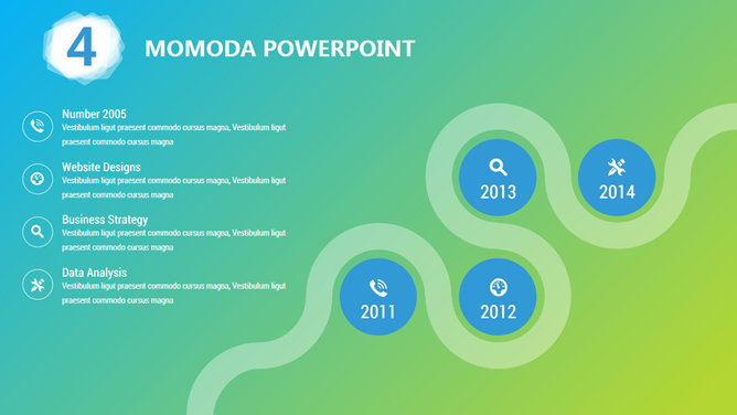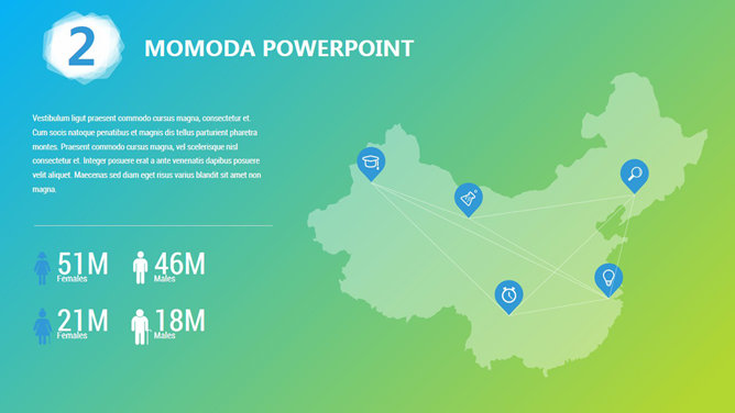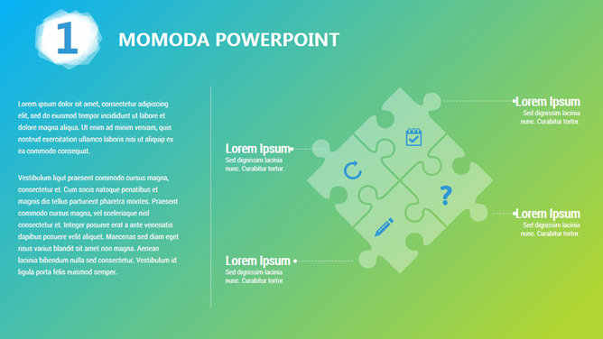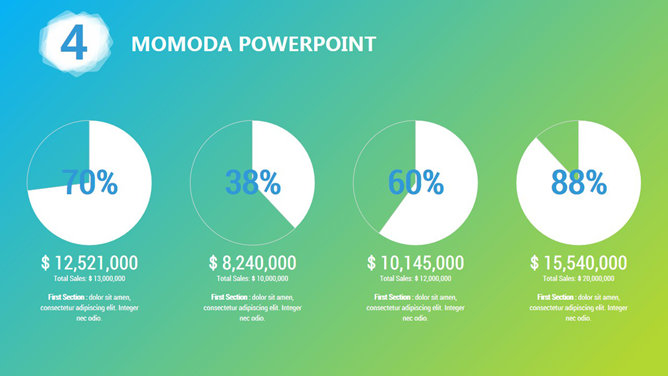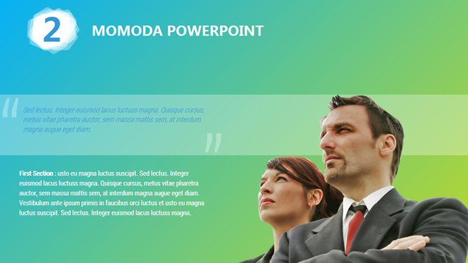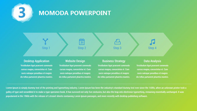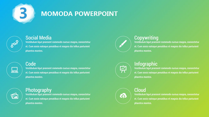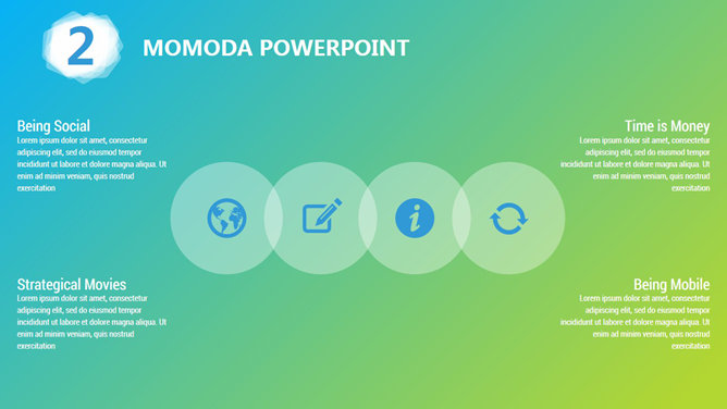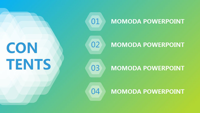 精美苹果风格多用途PPT模板。一份多功能多用途幻灯片模板,采用蓝绿渐变背景,白色字体及半透明图形元素,精美时尚,能胜任多种场合。所用字体:Roboto condensed light。