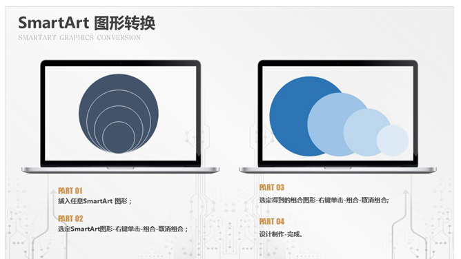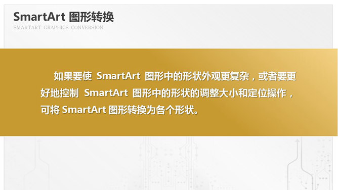 SmartArt图形转换PPT技巧。如果要使 SmartArt 图形中的形状外观更复杂,或者要更好地控制 SmartArt 图形中的形状的调整大小和定位操作,可将 SmartArt 图形转换为各个形状。步骤:1、插入任意SmartArt 图形;2、选定SmartArt图形-右键单击-组合-取消组合;3、选定得到的组合图形-右键单击-组合-取消组合。