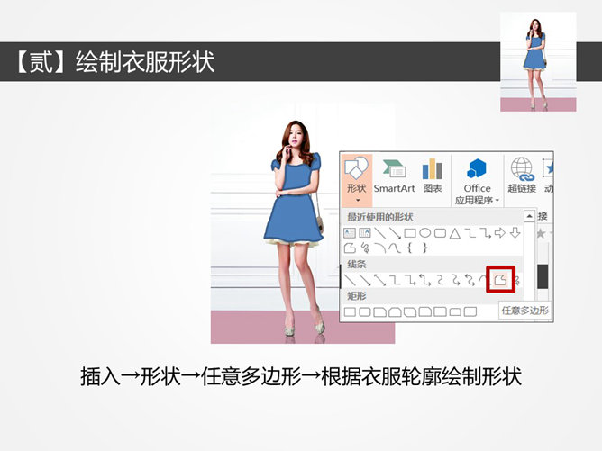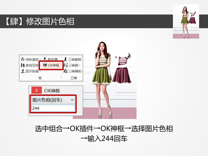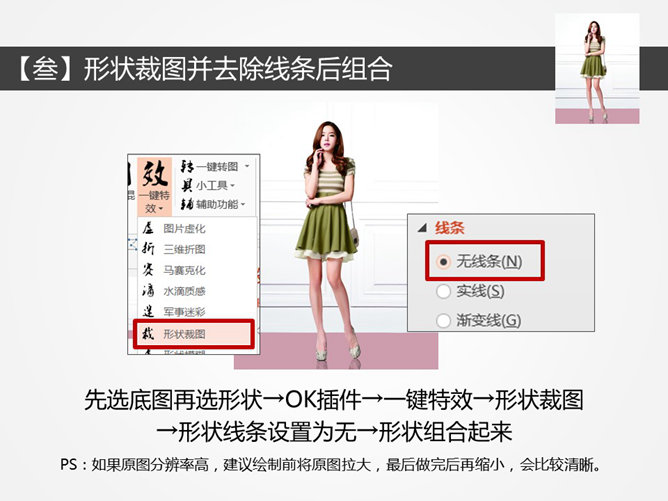 形状裁图和图片色相的运用。形状裁图和图片色相给美女换衣服。步骤:1、插入一张图片。2、绘制衣服形状:插入→形状→任意多边形→根据衣服轮廓绘制形状。3、形状裁图并去除线条后组合:先选底图再选形状→OK插件→一键特效→形状裁图→形状线条设置为无→形状组合起来。4、修改图片色相:选中组合→OK插件→OK神框→选择图片色相→输入244回车。5、将衣服跟原图重合。