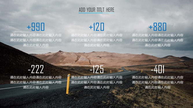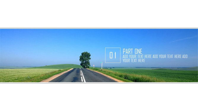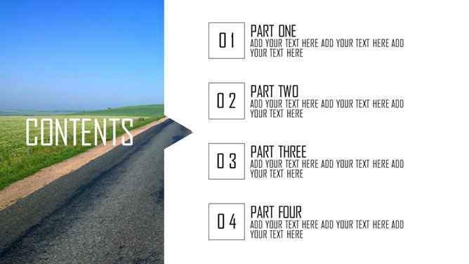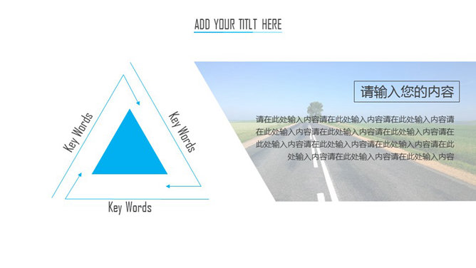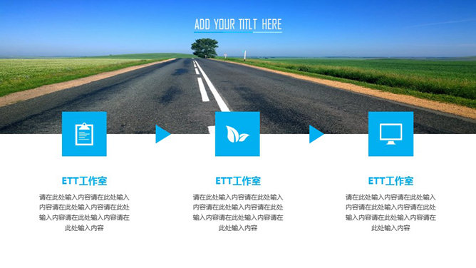 在路上动态杂志风PPT模板下载。一份时尚杂志风幻灯片模板,以公路特写图片为背景,蓝色主色调,简约时尚,动态演示,建议安装字体: