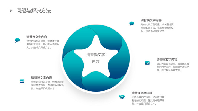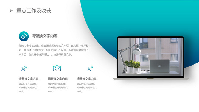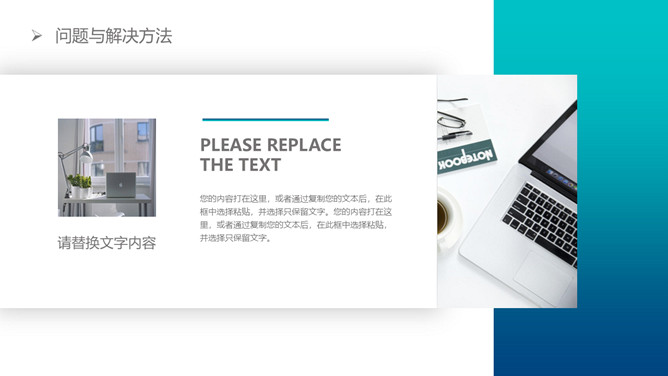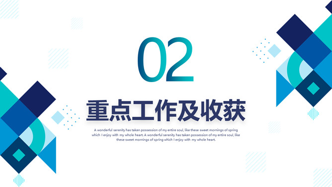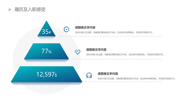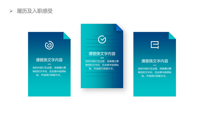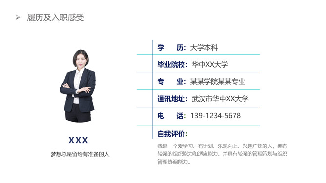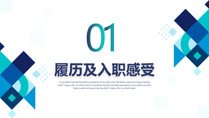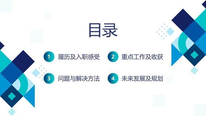 蓝色新员工转正述职报告PPT模板。内容包括履历及入职感受、重点工作及收获、问题与解决方法、未来发展及规划。