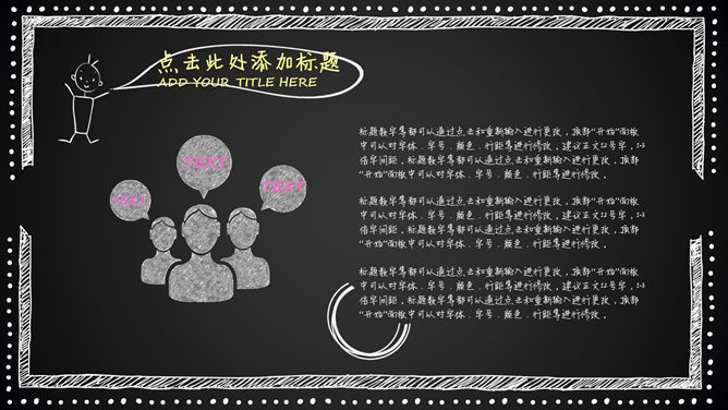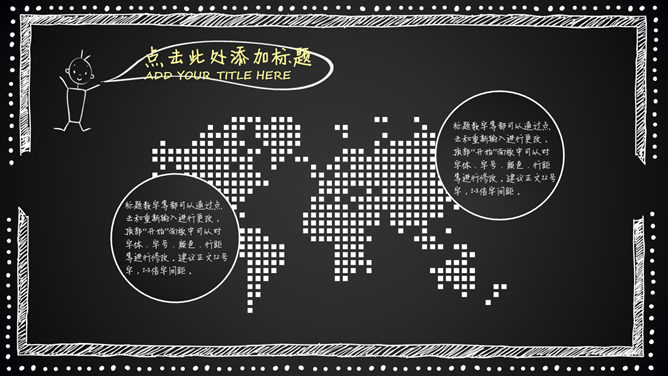 创意黑板粉笔字效果PPT模板。一份很有创意的幻灯片模板,黑板粉笔字风格,手绘图形配合儿童手写字体,效果逼真。建议安装字体: