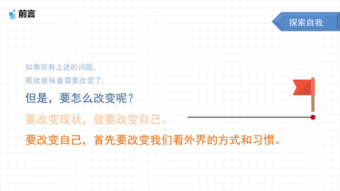 很忙,但是看不出来这样工作对将来有何意义。经常减肥,越减越肥。如果你有上述的问题,那就意味着需要改变了,但是,要怎么改变呢?要改变现状,就要改变自己。要改变自己,首先要改变我们看外界的方式和习惯。