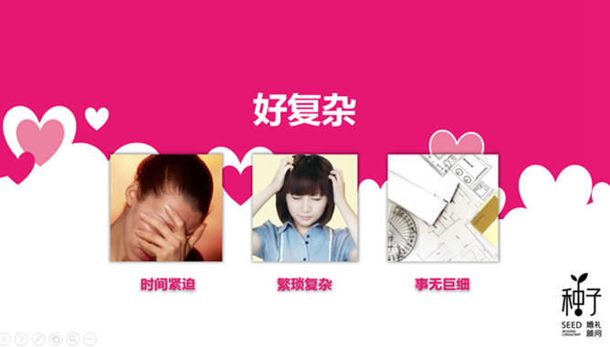 婚礼婚庆公司宣传介绍PPT模板。一份精美创意婚庆公司、婚礼策划工作室宣传介绍幻灯片模板,粉色主色调,安心装饰,华丽漂亮的动态播放效果。