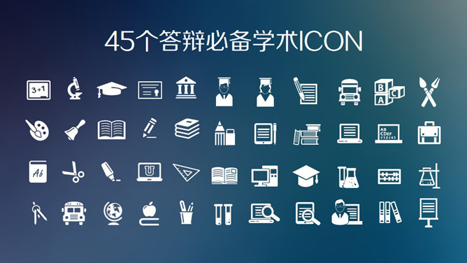 苹果IOS风论文答辩PPT模板。一份时尚好看的苹果风格毕业论文答辩幻灯片模板,共28页,页面类型丰富齐全,功能强大,另有45个学术答辩相关的小图标备用。建议安装字体: