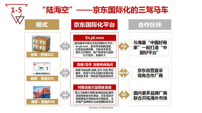 京东海外事业部介绍PPT模板。一份介绍京东海外事业部的幻灯片,包括京东是谁、京东的国际地位、京东国际化战略、京东海外战略布局、京东国际化主要策略-三驾马车。