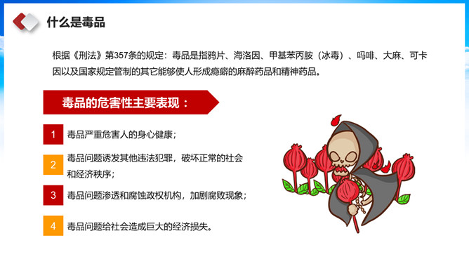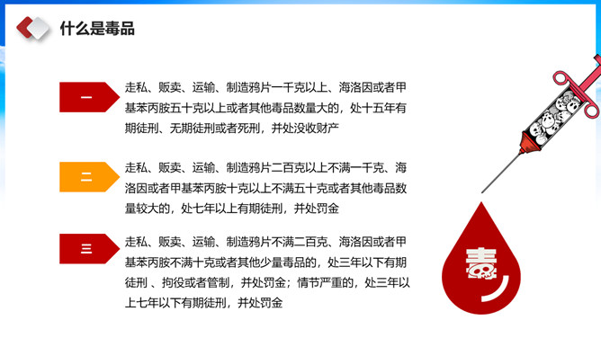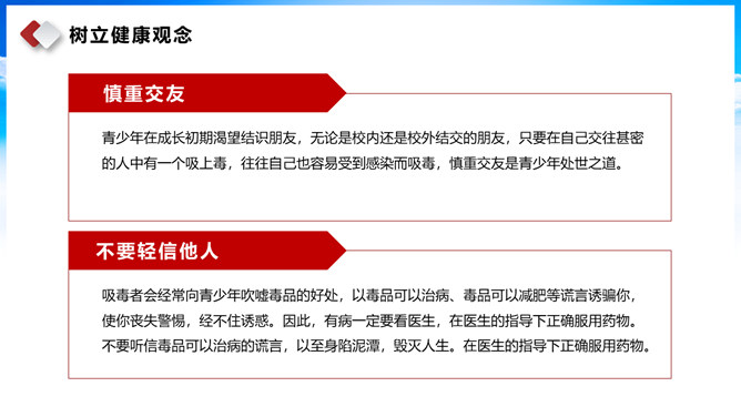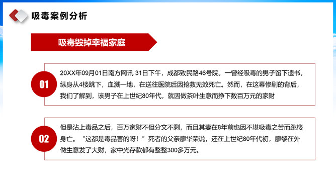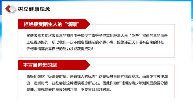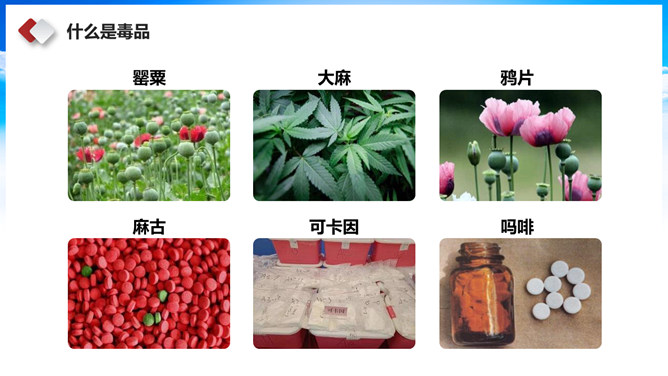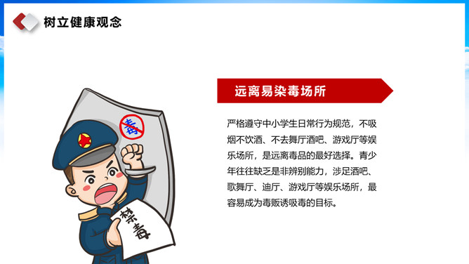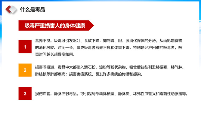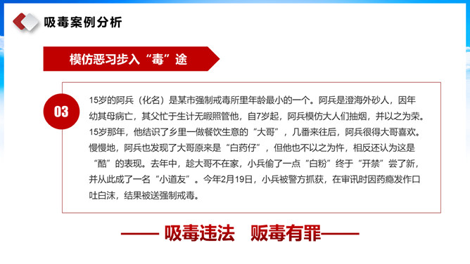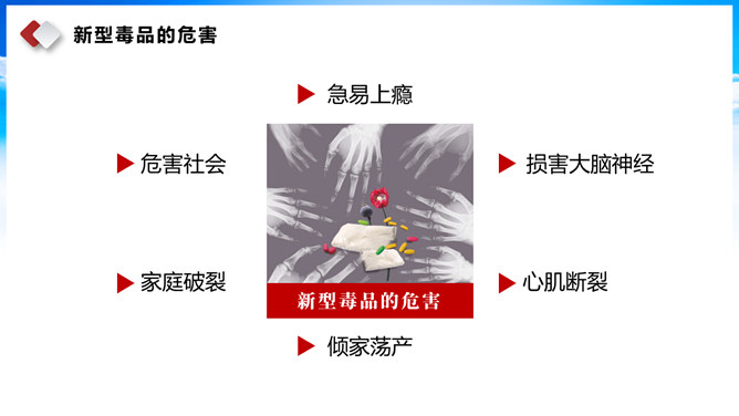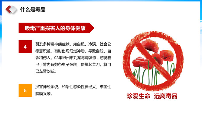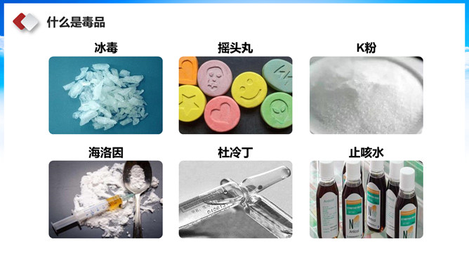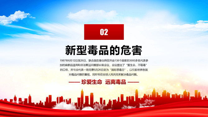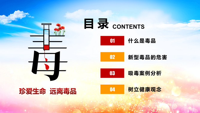 禁毒教育主题宣传活动PPT模板。内容包括什么是毒品、新型毒品的危害、吸毒案例分析、树立健康观念。