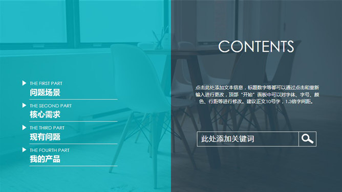 产品介绍宣传推介PPT模板。一份适合用于介绍产品推介使用的幻灯片模板,扁平化设计风格,淡入淡出切换效果,使用时把背景图片换成您的产品图片即可。