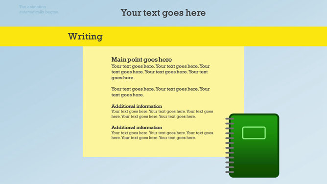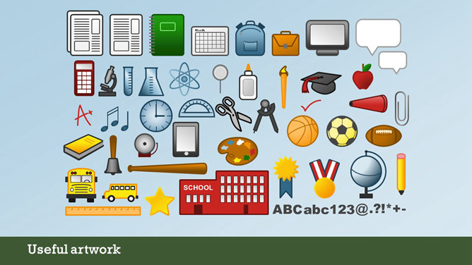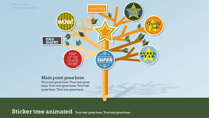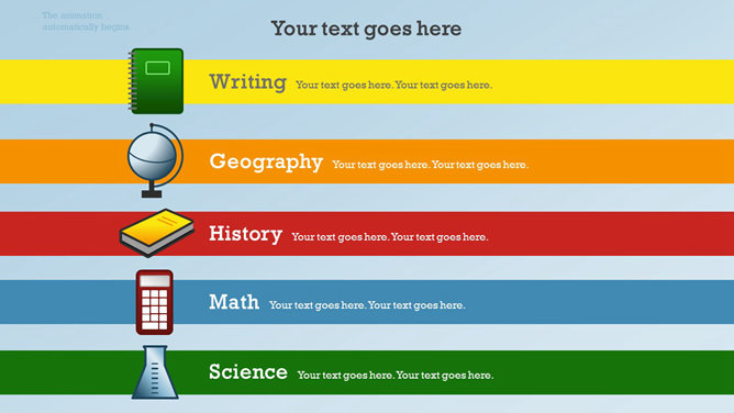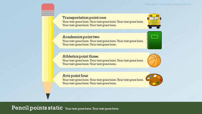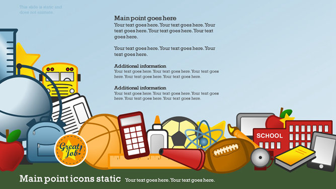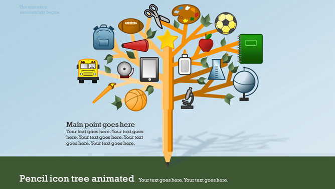 一份创意学校学生教育相关PPT模板,矢量扁平化风格,以足球、篮球、笔记本、地球仪、校车、画笔画板等校园元素设计,动态铅笔树生长展开效果,另有多种图标素材。
