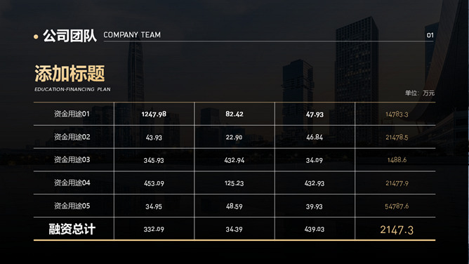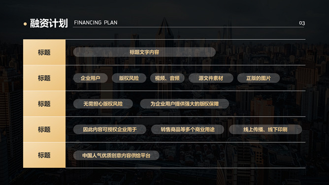 大气黑金商业融资计划书PPT模板。一套企业公司商业融资计划书模板,大气稳重黑金配色,简约设计,动态播放。