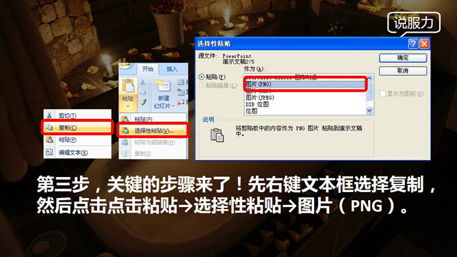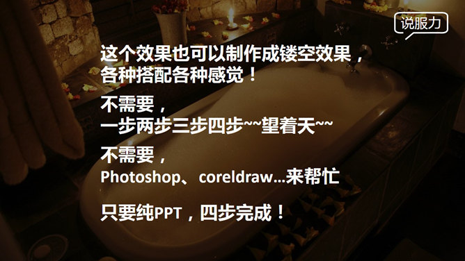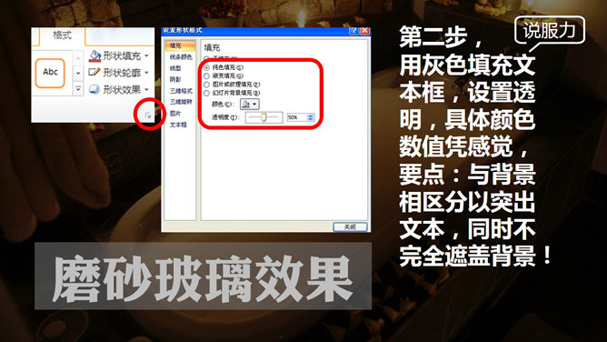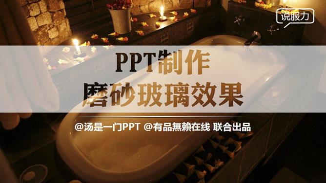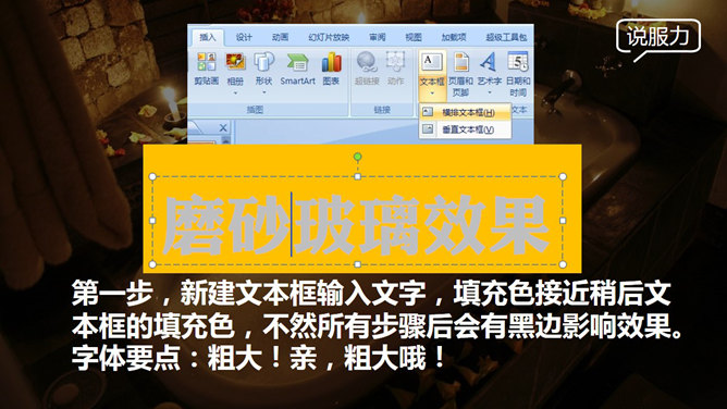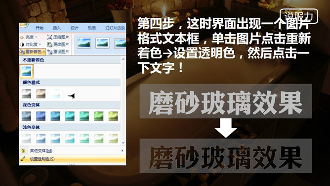 制作磨砂玻璃效果PPT教程。这个效果也可以制作成镂空效果,各种搭配各种感觉!不需要Photoshop、coreldraw…来帮忙,只要纯PPT,四步完成!第一步,新建文本框输入文字,填充色接近稍后文本框的填充色,不然所有步骤后会有黑边影响效果。字体要点:粗大!亲,粗大哦!第二步,用灰色填充文本框,设置透明,具体颜色数值凭感觉,要点:与背景相区分以突出文本,同时不完全遮盖背景!第三步,关键的步骤来了!先右键文本框选择复制,然后点击点击粘贴→选择性粘贴→图片(PNG)。第四步,这时界面出现一个图片格式文本框,单击图片点击重新着色→设置透明色,然后点击一下文字!