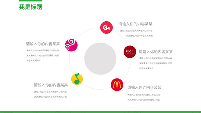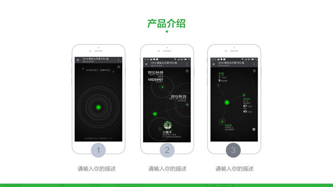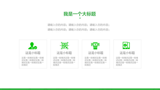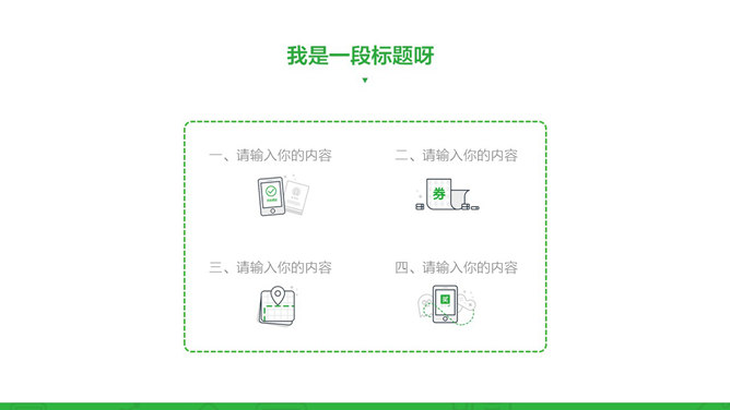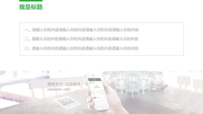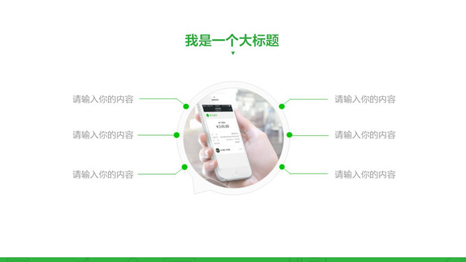 微信公众号营销汇报PPT模板。一份微信公众号运营、微信营销工作总结汇报使用的幻灯片模板,彩色绿色主题色调,简约实用。建议安装字体: