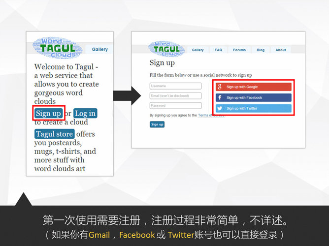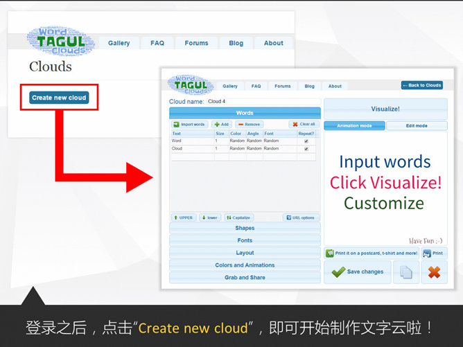文字云制作PPT教程(一)。大神Simon阿文文字云制作全攻略。最近很多同学问我带中文的文字云怎么弄,其实,很简单!你需一个支持中文的神器,神器一:TAGUL.com,这是一个在线文字工具,登录之后点击“Create new clound”,即可开始制作文字云了,配置很简单,只要由上往下按顺序配置即可。