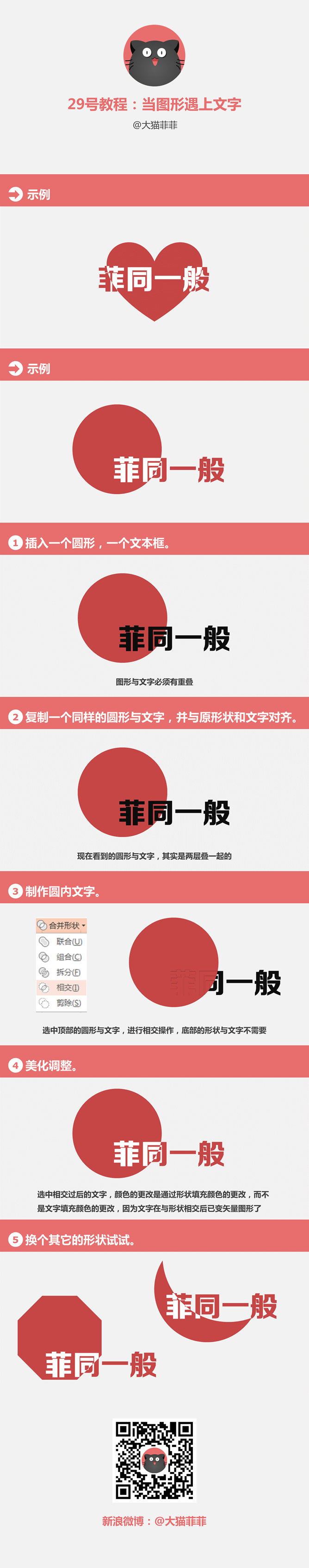 图形文字相交效果PPT教程。大猫菲菲29号教程:当图形遇上文字。步骤:1、插入一个圆形,一个文本框。2、复制一个同样的圆形与文字,并与原形状和文字对齐。3、制作园内文字。4、美化调整。5、换个其他的形状试试。