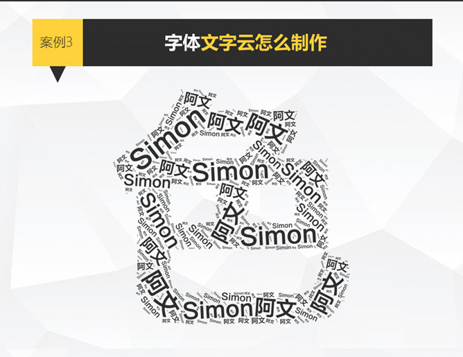 文字云制作PPT教程(二)。大神Simon阿文文字云制作全攻略(二)。案例二,图片文字云怎么制作。第一步,输入人物关键词。第二步,准备一张图片素材,背景越空白越好。第三步,导入图片。在“Shapes”选项卡中点击add your image,导入你的图片素材,或图片所在的网址。第四步,图片导入后。调整各项参数,通常调整阈值即可,使人脸只保留基本轮廓,点击确认。第五步,点击预览,发现图片细节还不够丰富。继续微调,往下看。第六步,在“Layout”选项中,更改关键字体位,使关键字以更多的角度丰富细节。第七步,更改关键字数量为固定值,达到最大值999……