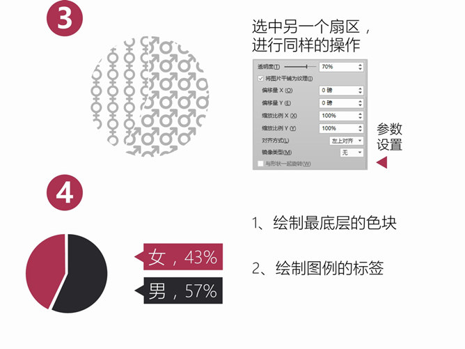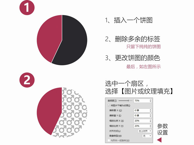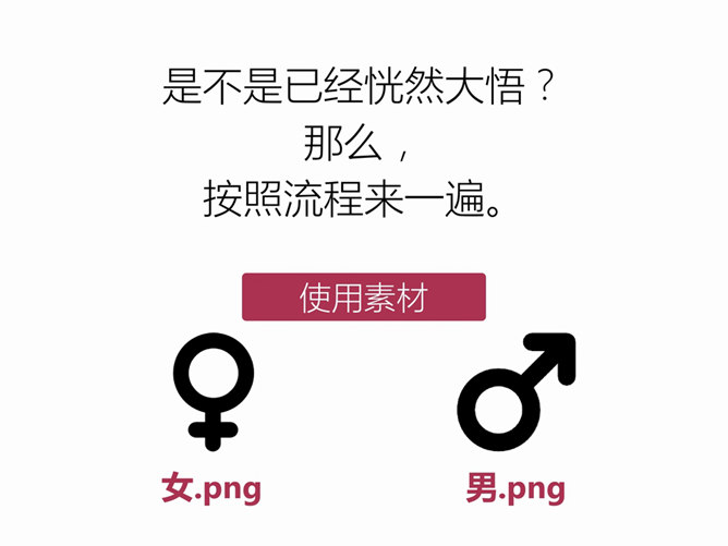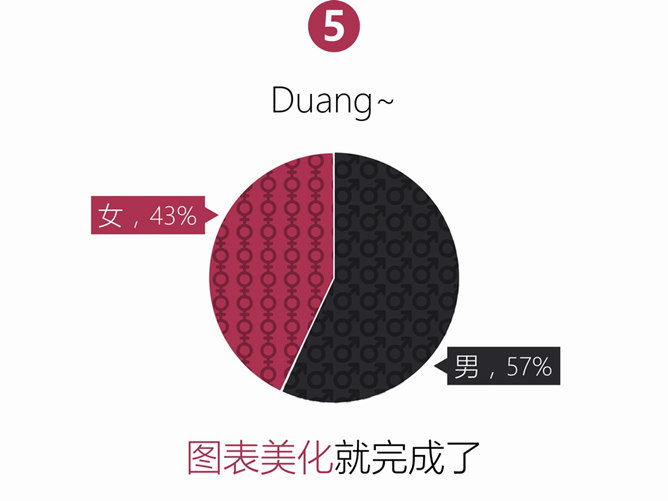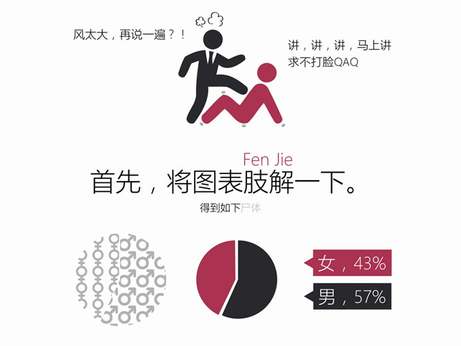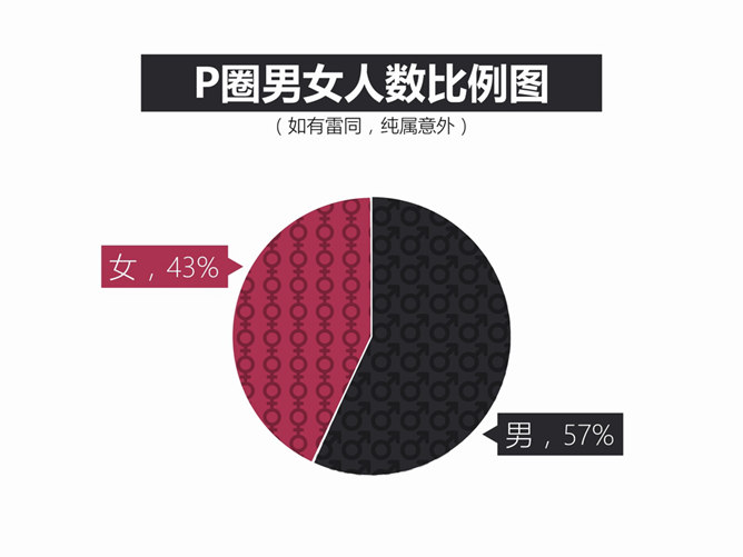 PPT男女比例饼图美化教程。首先请看示例饼图(如有雷同,纯属意外)。怎么做,急,在线等!卧槽,厉害!老司机带带我!这个嘛……给糖吃就告诉你。风太大,再说一遍?!别打脸……首先将这个饼图肢解以下。得到如下,是不是已经恍然大悟?那么,按照流程来一遍……