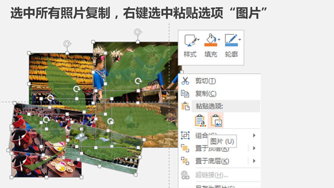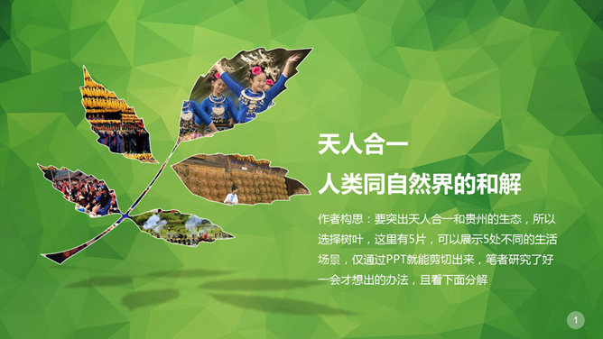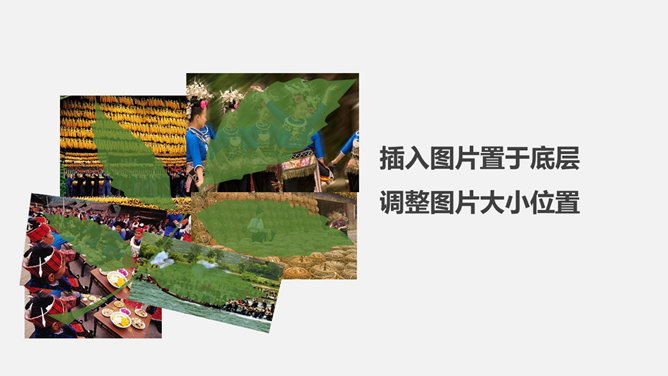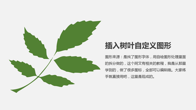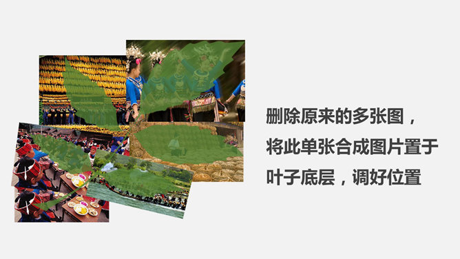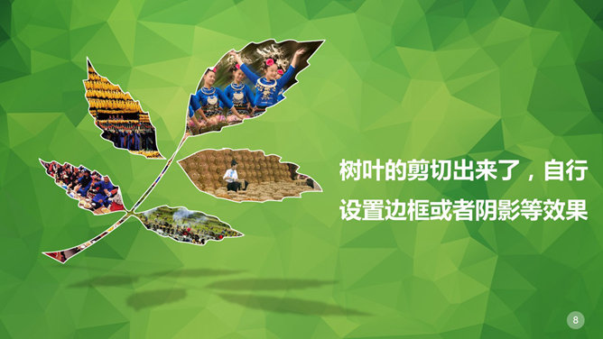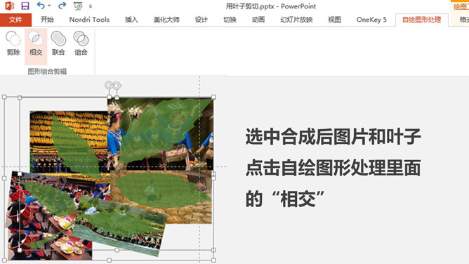 剪切制作叶子形状图片PPT教程。步骤:1、插入树叶自定义图形。将树叶颜色设置透明一点。2、插入图片置于底层,调整图片大小位置。3、选中所有照片复制,右键选中粘贴选项“图片”。4、删除原来的多张图,将此单张合成图片置于,叶子底层,调好位置。5、选中合成后图片和叶子,点击自绘图形处理里面的“相交”。6、树叶的剪切出来了,自行设置边框或者阴影等效果。