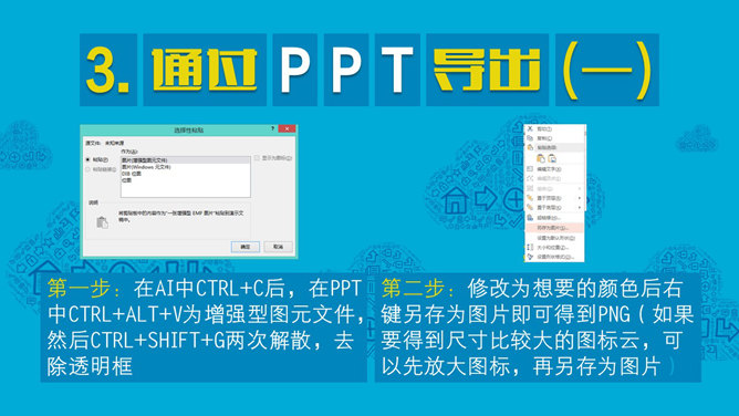 3分钟带你玩转PPT图标云。什么是图标云?就是图片被图标符号填充的效果。这么酷炫的效果使怎么做到的呢?巧妇难为无米之炊,首先你得准备好下锅的米。你需要素材有:图片、符号字、文字云工具。制作图标云推荐使用PNG格式图片,获取方法有三种:通过ICON网站获取;通过AI矢量导出;通过PPT导出。图标云的关键在于符号字体……