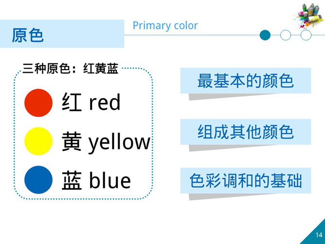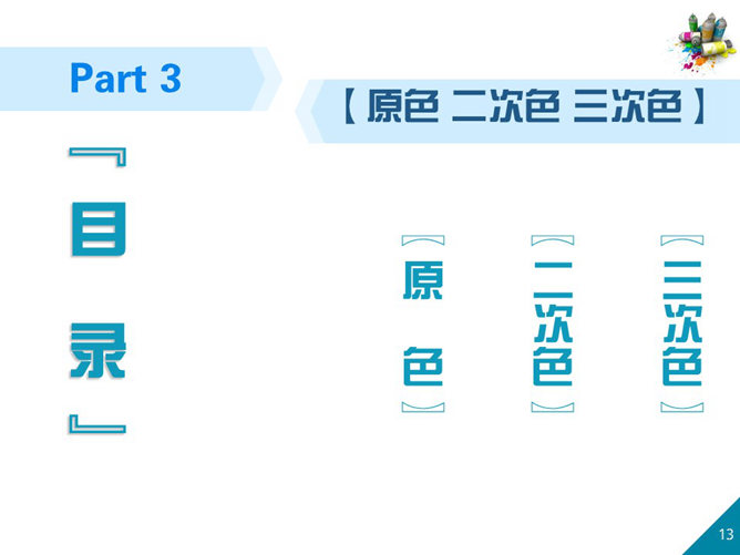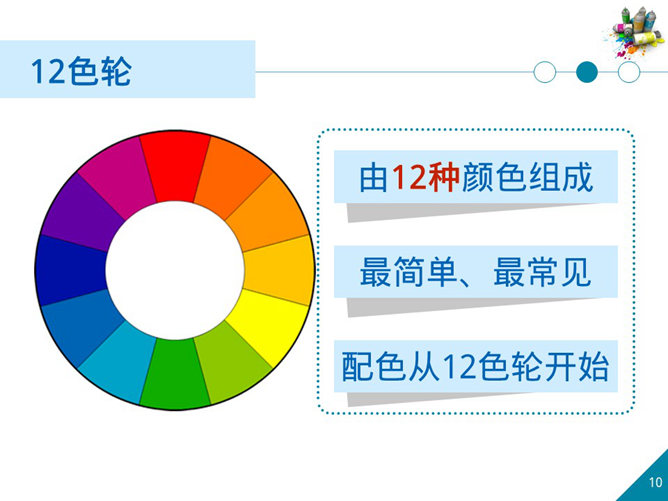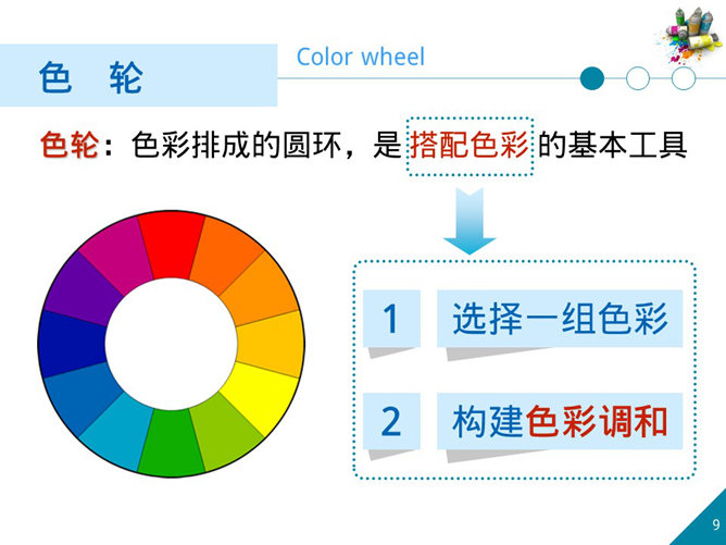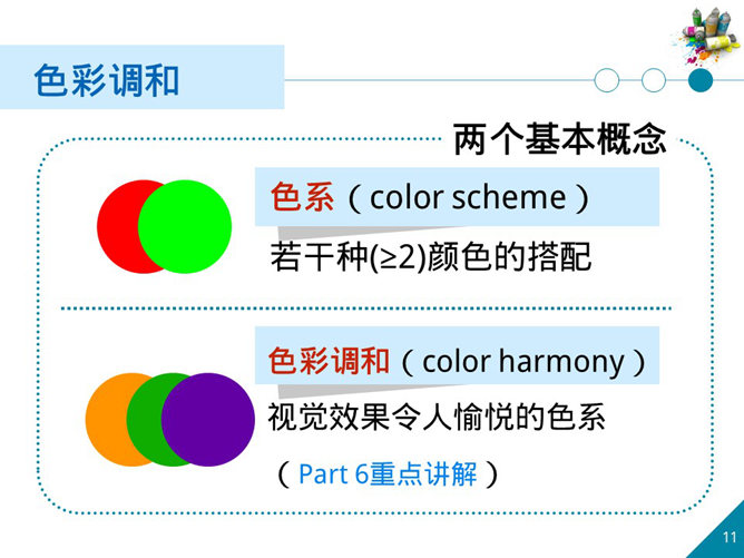 色彩调和PPT配色的基本技巧。色彩用于表达可吸引眼球、渲染情境、表达观点。作用于人能让人活跃,让人沉静。色彩正确搭配能营造优雅的气氛,描摹多彩的青春。色彩只要有效运用就会成为最给力的设计元素。