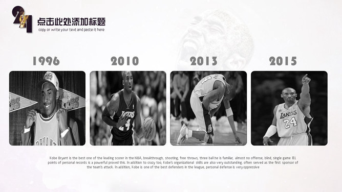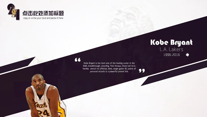 致敬科比退役PPT模板。桀骜永不退役,向伟大的NBA球员-科比致敬。建议安装字体: