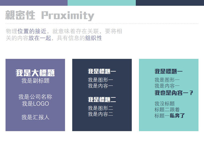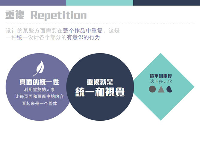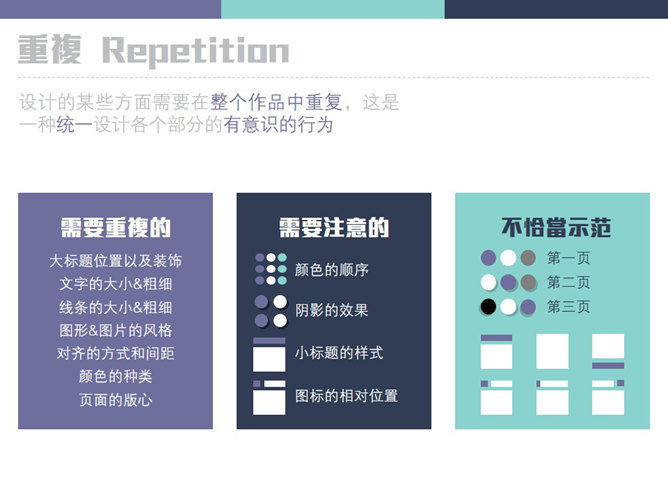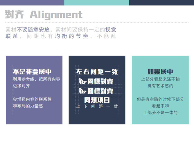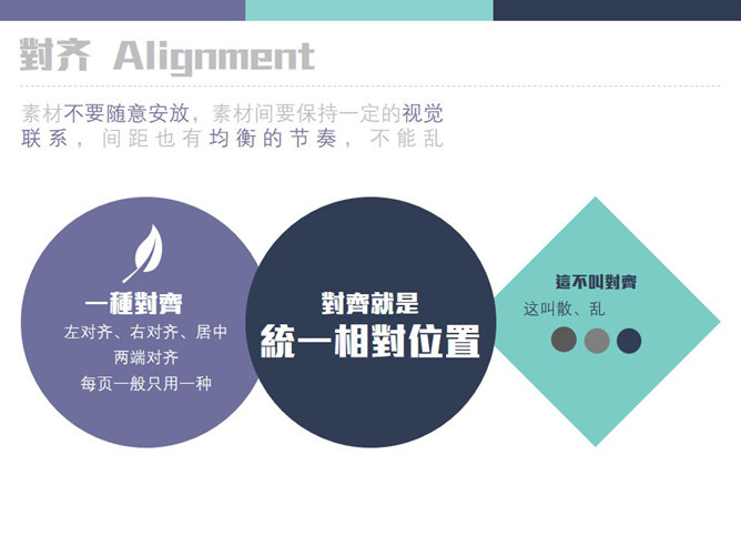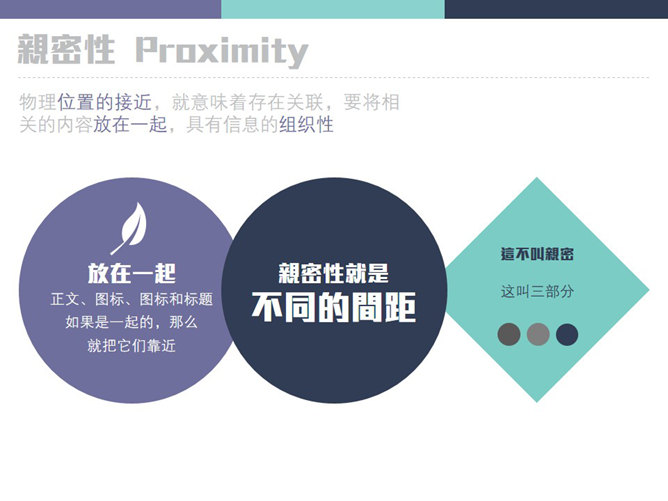 新手PPT设计需要把握的原则。亲密性:物理位置的接近,就意味着存在关联,要将相关的内容放在一起,具有信息的组织性。对齐:素材不要随意安放,素材间要保持一定的视觉联系,间距也有均衡的节奏,不能乱。重复:设计的某些方面需要在整个作品中重复,这是一种同一设计各个部分的有意识的行为。对比:字体、颜色、大小、线条、形状都会产生对比,增强页面效果,使信息更有组织性。