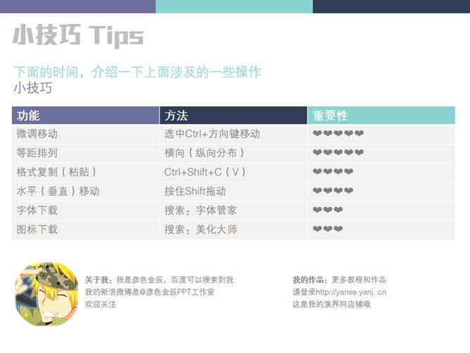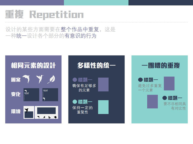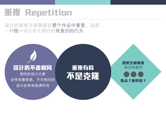 新手PPT设计需要把握的原则。亲密性:物理位置的接近,就意味着存在关联,要将相关的内容放在一起,具有信息的组织性。对齐:素材不要随意安放,素材间要保持一定的视觉联系,间距也有均衡的节奏,不能乱。重复:设计的某些方面需要在整个作品中重复,这是一种同一设计各个部分的有意识的行为。对比:字体、颜色、大小、线条、形状都会产生对比,增强页面效果,使信息更有组织性。