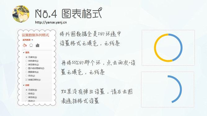 新人也学得会的PPT数据图表美化之微立体环形图。1、设置背景:PPT的背景色设置线性渐变,方向90度,颜色上浅下深。2、插入图表:插入一个圆环图表,将标题网格、图例等去掉后,进行设置,只留两行数据。3、数值设置:上一步完成后,增加一列数值为1。4、图表格式:将外围数据全是1的环选中,设置格式无填充,无线条。再将55%的那个环,点击两次,设置无填充,无线条。如果没有弹出设置,请右击图表选择格式设置……
