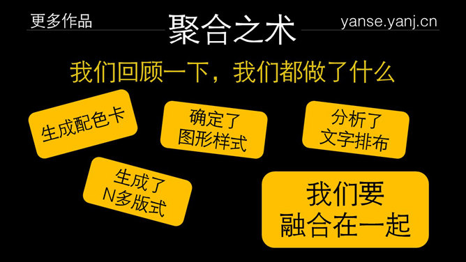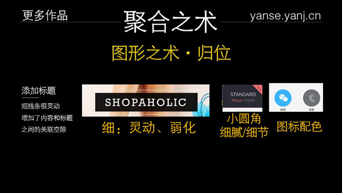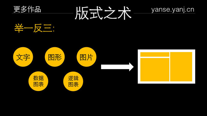 可以从其他PPT作品借鉴哪些设计元素?可以从颜色、质感、文字、图片、图形、版式几个方面借鉴。颜色之术:看背景、第一感觉就是主色调,不明显的是辅助色,明显和比较亮的就是强调色。图形之术:从线条、色块、图标几个方面……