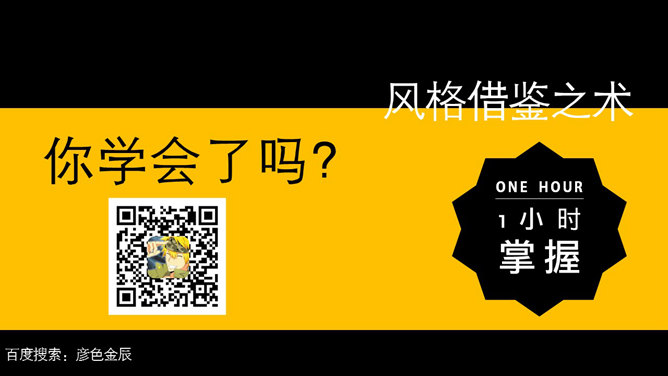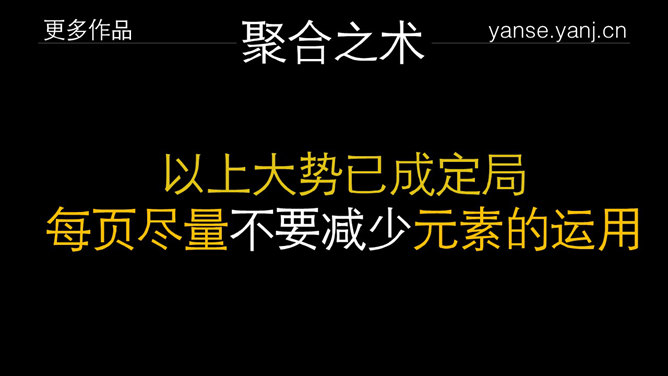 可以从其他PPT作品借鉴哪些设计元素?可以从颜色、质感、文字、图片、图形、版式几个方面借鉴。颜色之术:看背景、第一感觉就是主色调,不明显的是辅助色,明显和比较亮的就是强调色。图形之术:从线条、色块、图标几个方面……
