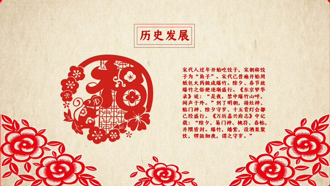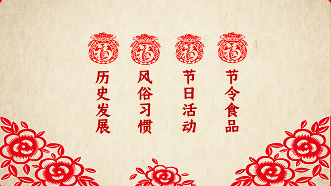 春节传统习俗介绍PPT模板。内容包括历史发展、风俗习惯、节日活动、节令食品。