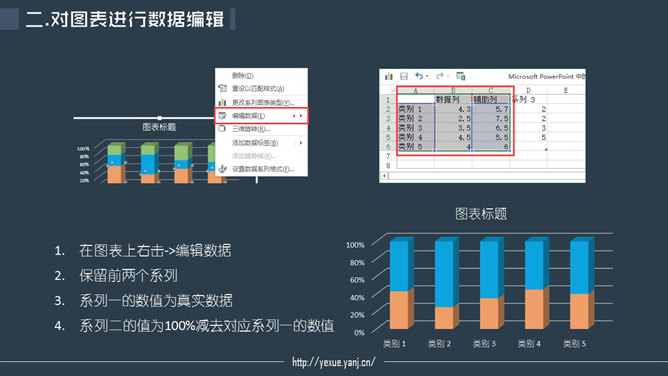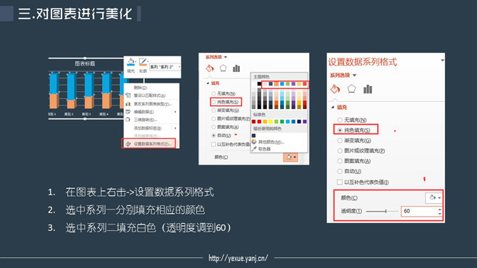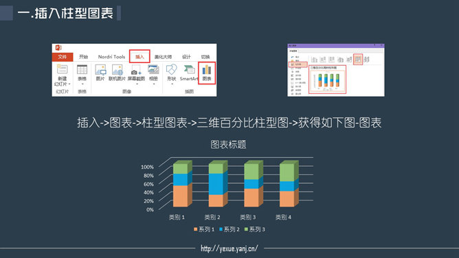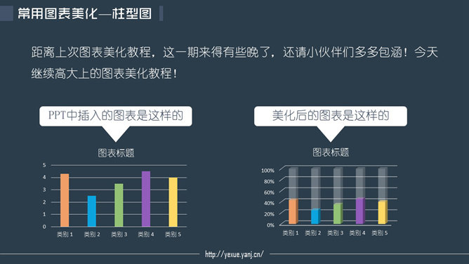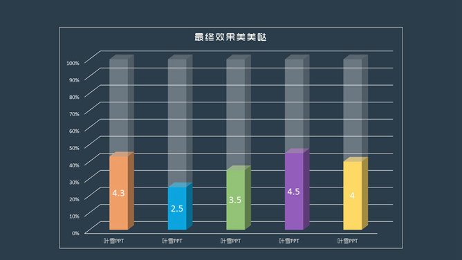 PPT默认插入的柱形图是这样的,美化后是这样的。步骤:一、插入柱形图。插入-图表-柱形图表-三维百分比柱形图。二、对图表进行数据编辑。在图表上右键点击-编辑数据。保留前两个系列,系列一的数值为真是数据,系列二的值为100%减去对应系列一的数值。三、对图表进行美化。图表上右键点击-设置数据系列格式。选中系列一分别填充相应的颜色。选中系列二填充白色,透明度调到60。