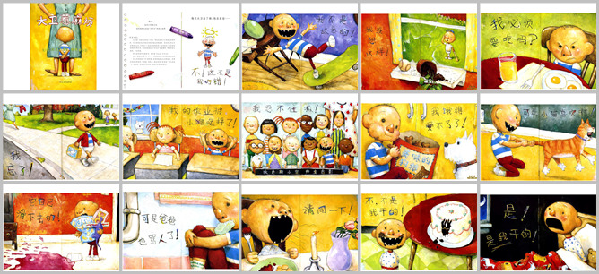 《大卫惹麻烦》绘本故事PPT。每次大卫闯了祸,他总是说:不!这不是我的错。大卫在屋里滑滑板把桌子撞倒了,他说:我不是故意的!大卫打棒球时,把玻璃打碎了,他说:我没想这样!吃早饭时面对着鸡蛋和饮料,他说:我必须要吃吗?早晨拿书包去上学,竟然没穿裤子,他说:我忘了!到了学校没带作业本,他说:我的作业被小狗吃掉了!和老师同学们合影,他做起了鬼脸,他说:我忍不住嘛!大卫竟然吃起了小狗的狗粮,他说:我饿得受不了了!大卫抓着小猫的尾巴说:可是小猫喜欢啊!大卫把颜料洒了一地说:是它自己滑下去的!大卫被爸爸批评的时候说:可是爸爸也骂人了!