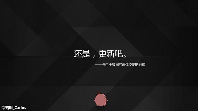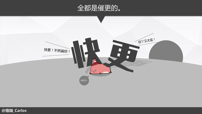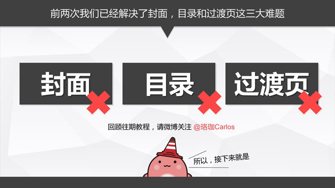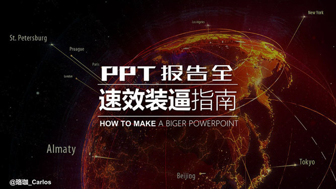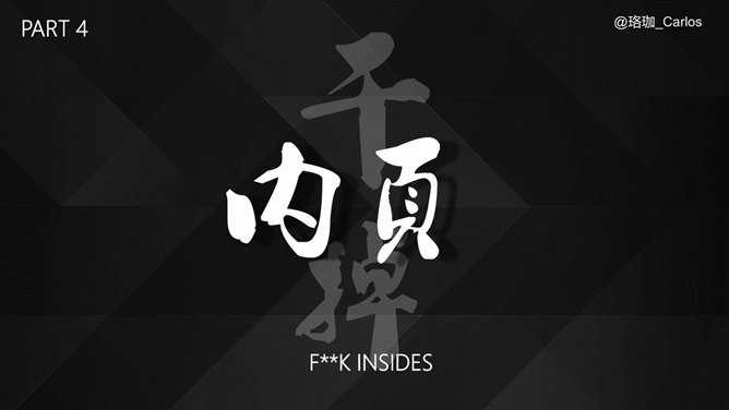PPT速效装逼指南-内页&尾页篇。前面两个教程我们已经解决了封面、目录和过渡页这三大难题,接下来就是内页,这是一个噩梦,你永远都想不到这个世界上又多少有“创意”的内页,如下示例,作者系统崩溃了……其实内页大致可以分为如下几种:1.全文字型。2、多文字少图片型。3、多图片少文字型。4、全图片型。先解决多文字型。其实文字多的情况无非就两种,能删和不能删的……BY@珞珈_Carlos。
