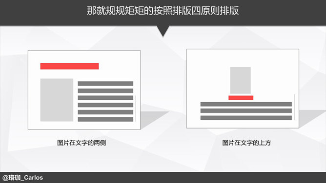 PPT速效装逼指南-内页&尾页篇。前面两个教程我们已经解决了封面、目录和过渡页这三大难题,接下来就是内页,这是一个噩梦,你永远都想不到这个世界上又多少有“创意”的内页,如下示例,作者系统崩溃了……其实内页大致可以分为如下几种:1.全文字型。2、多文字少图片型。3、多图片少文字型。4、全图片型。先解决多文字型。其实文字多的情况无非就两种,能删和不能删的……BY@珞珈_Carlos。