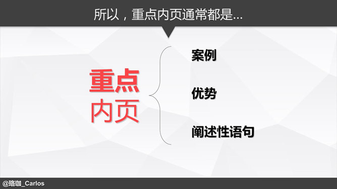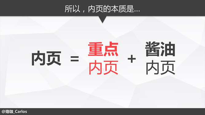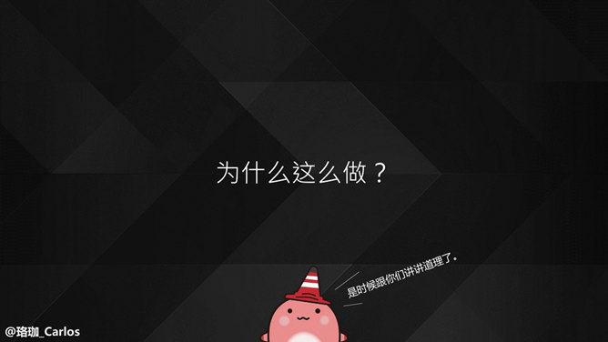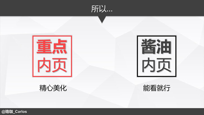 PPT速效装逼指南-内页&尾页篇。前面两个教程我们已经解决了封面、目录和过渡页这三大难题,接下来就是内页,这是一个噩梦,你永远都想不到这个世界上又多少有“创意”的内页,如下示例,作者系统崩溃了……其实内页大致可以分为如下几种:1.全文字型。2、多文字少图片型。3、多图片少文字型。4、全图片型。先解决多文字型。其实文字多的情况无非就两种,能删和不能删的……BY@珞珈_Carlos。