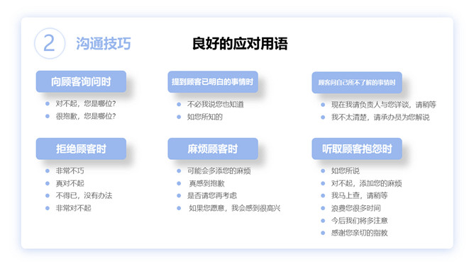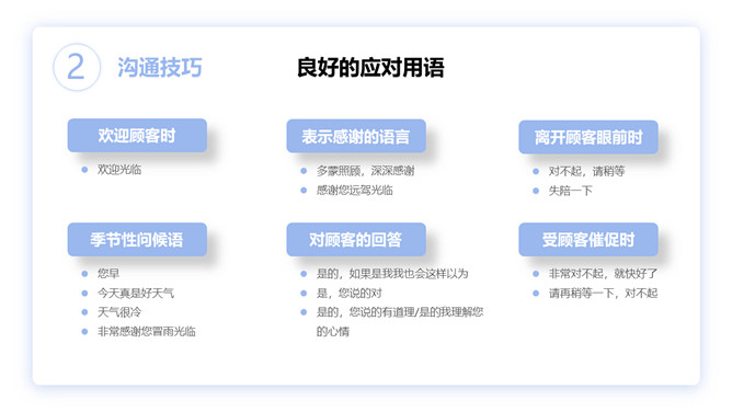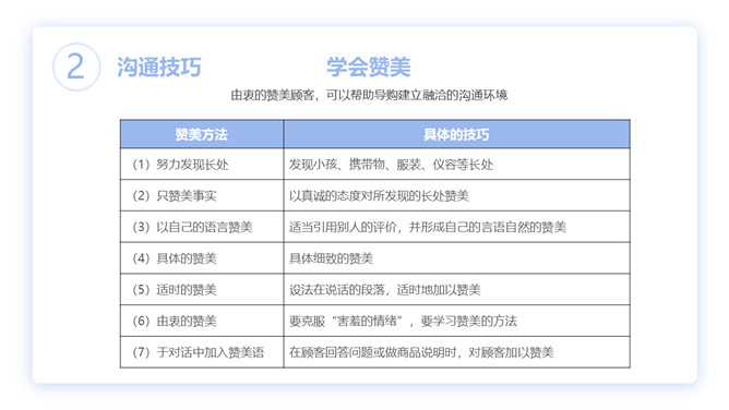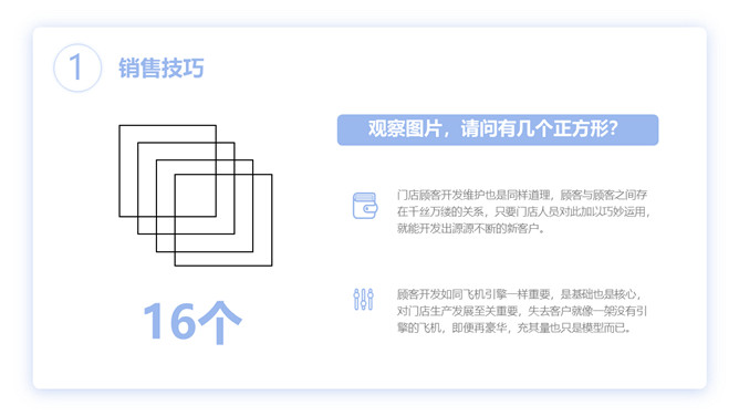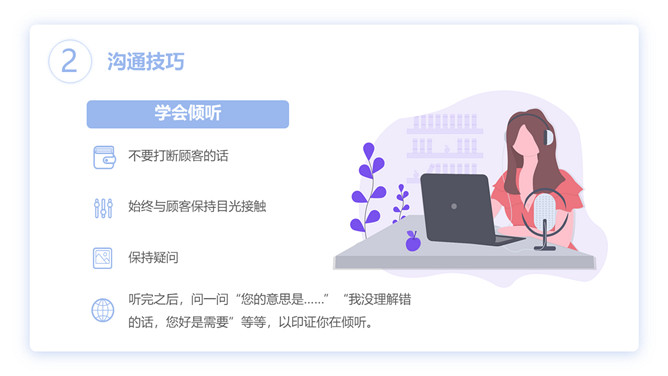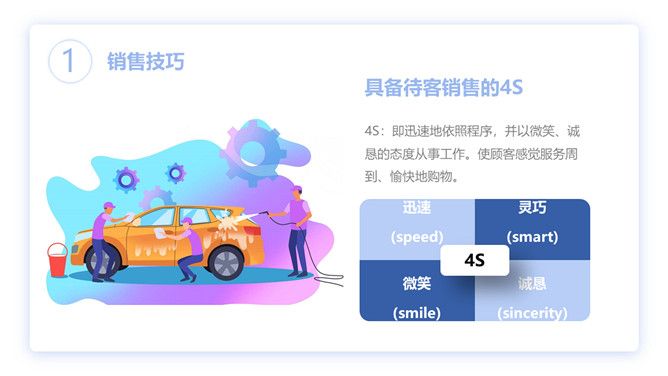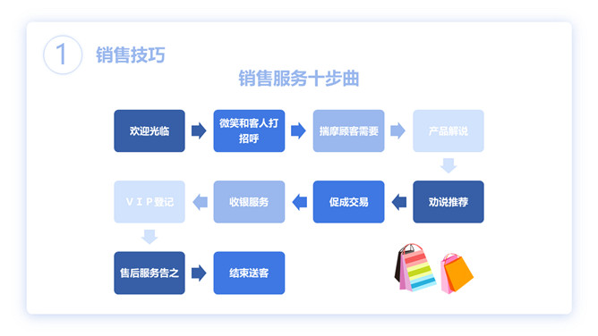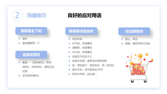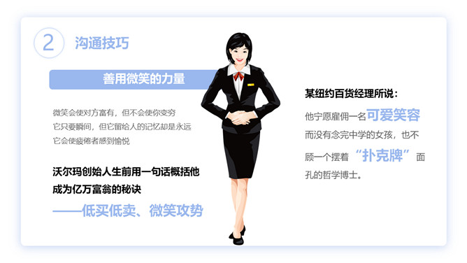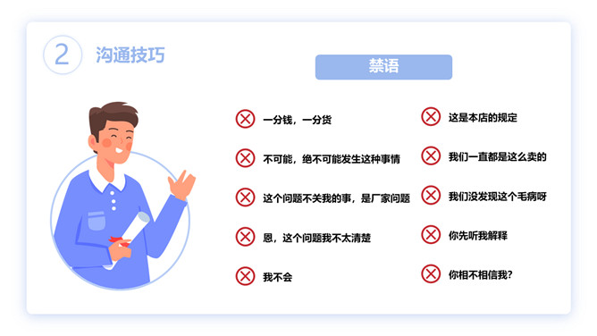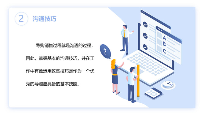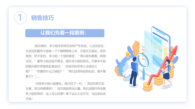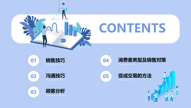 销售技巧话术培训PPT模板。包括销售技巧、沟通技巧、顾客分析、消费者类型及销售对策、促成交易的方法。