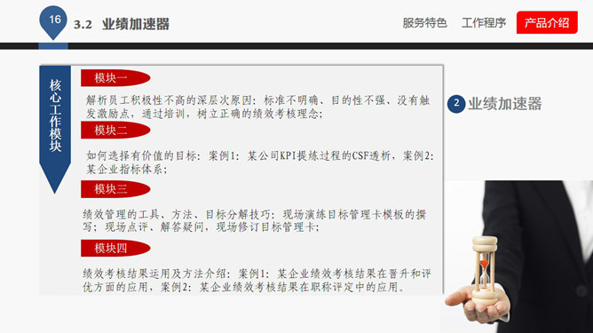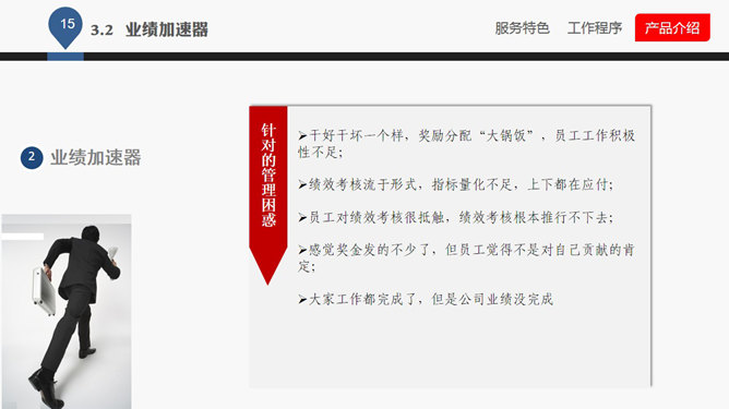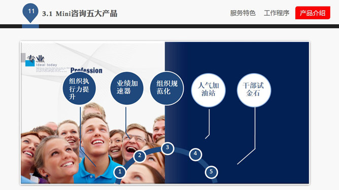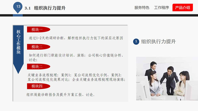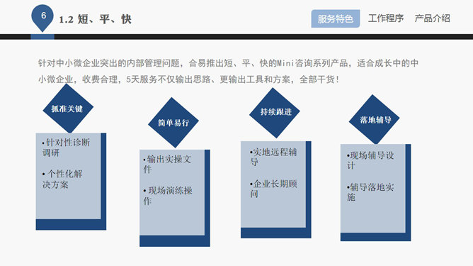 企业管理咨询公司介绍PPT课件。一份企业管理咨询公司服务产品介绍课件,大气商务风格排版布局及配色,很有参考价值,首页及目录页等页面请从母版编辑。