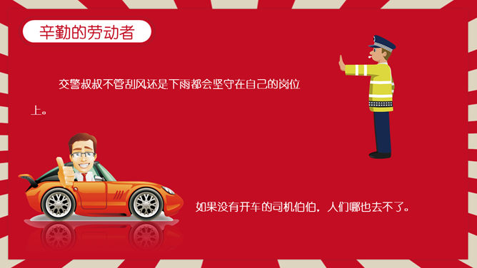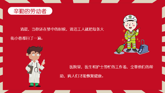 劳动节主题班会PPT模板。一套五一国际劳动节主题班会幻灯片模板,红色背景,趣味卡通设计风格。